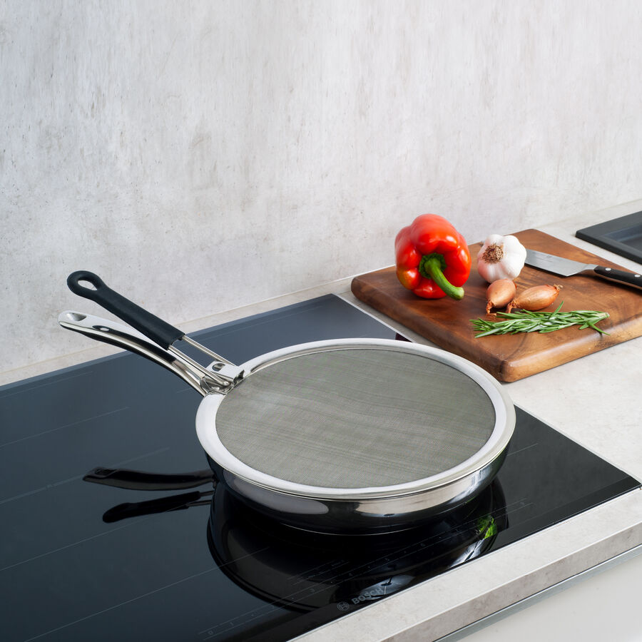 • Image du produit pour 'Couvercle anti-projections pour poêle : la structure en acier inoxydable à mailles serrées retient les particules de graisse les'