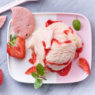 3 Nettoyer les fraises à sec, enlever le pédoncule et couper les fruits en deux. Mélanger avec 50 g de sucre et de jus de citron, réduire en purée et incorporer au mélange de glace refroidi. Verser et laisser prendre le mélange dans la sorbetière.