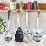 En acier inoxydable brossé de 2,5 mm d'épaisseur, 32 x 10,5 cm (l/h), louche 10,5 x 7 cm, lavable au lave-vaisselle.