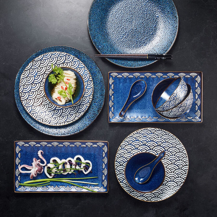 Savourez une soirée asiatique parfaite avec ce service de table au motif traditionnel, synonyme au Japon de bonheur et d'énergie. Seigaiha (« la vague ») est originaire de l'Empire Sassanide (2ème Empire persan de l'Antiquité) et est arrivée au Japon via la Perse et la Chine. L'indigo foncé et les bords dorés confèrent à ces cuillères une élégance charmante.