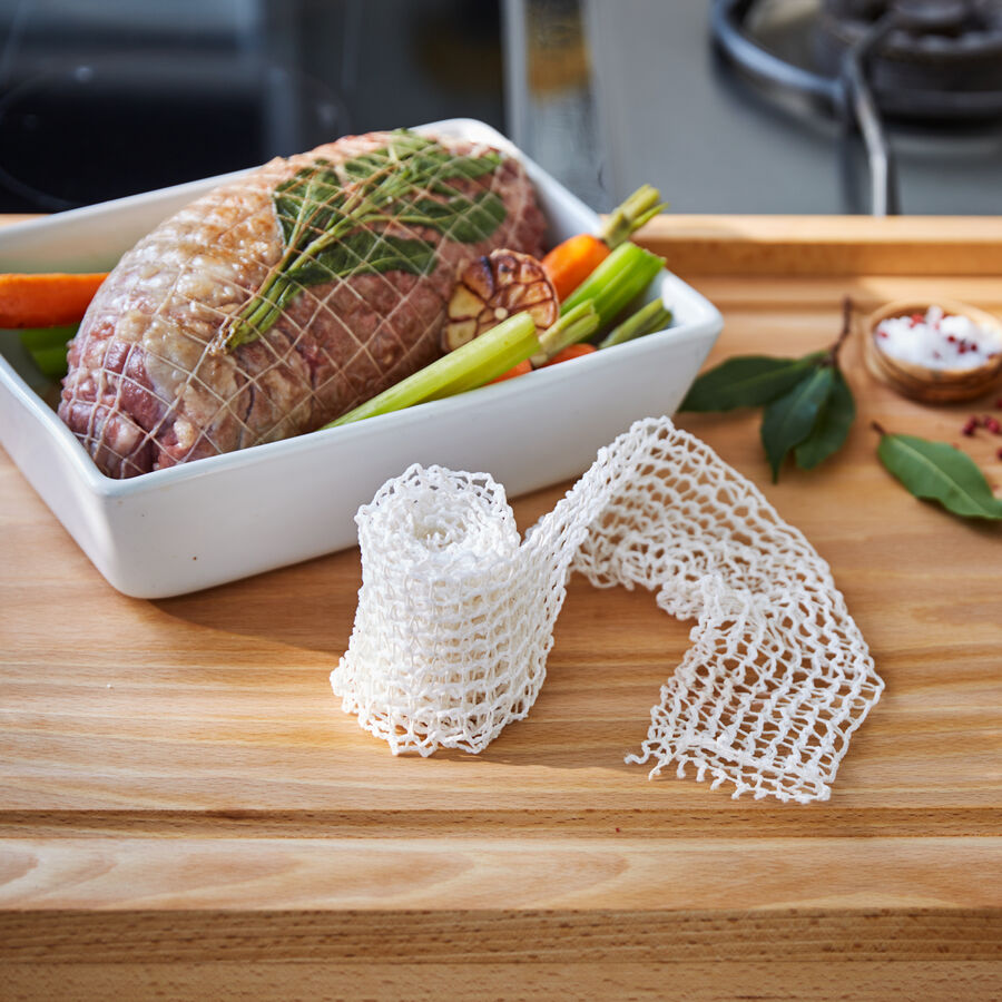 Vous pouvez désormais combiner et cuire une grande variété d'aliments en toute simplicité : poitrines de volaille farcies, rouleaux de filets de poisson fins, farces aromatiques enrobées de légumes délicats ou roulades classiques. Glissez votre préparation d'un diamètre maximal de 14 cm et d'un poids maximal de 1,5 kg (par exemple, un rôti roulé) dans le filet de cuisson extensible, découpé à la taille voulue et nouez facilement si nécessaire les extrémités. Lors de la cuisson dans la poêle ou au four, le filet maintiendra tous les aliments et se laissera détacher sans adhérer au moment de servir. Même les délicieuses croûtes seront préservées.