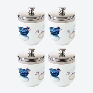 Coquetiers en porcelaine dure - Set de 4, Ø 6,5 cm, 150 ml, décor poule, pour 3 oufs, avec couvercle inox, oufs mollets en 6-9 min, recettes incluses