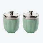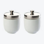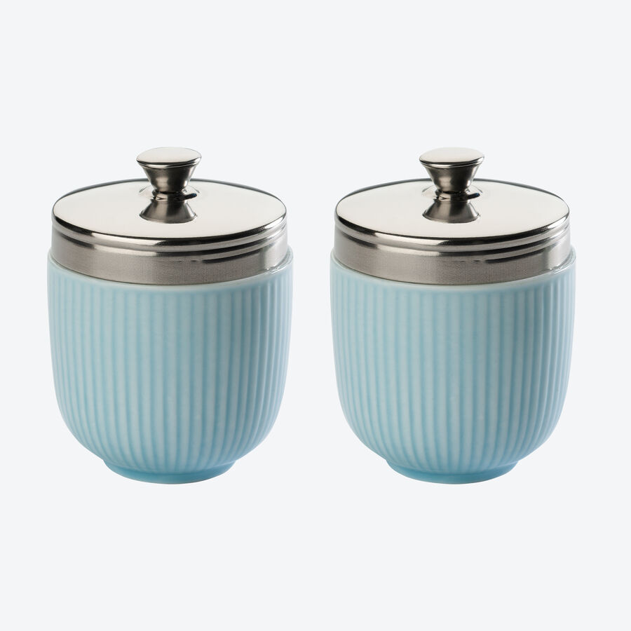 Contenance 150 ml, Ø 6,5 cm, 9 cm de hauteur. Porcelaine culinaire extra dure au joli décor rainuré, couvercle en acier inoxydable.
