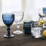 Ces verres, gracieux et élégants, sont cependant particulièrement robustes. Les fines feuilles de laurier ornant le bord créent par réfraction de la lumière dans le vin ou l'eau de jolis reflets scintillants.
