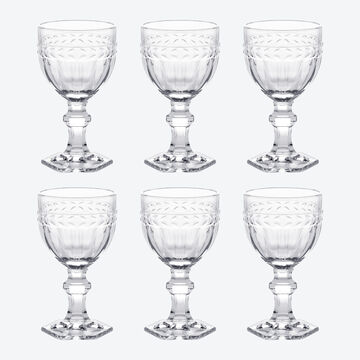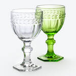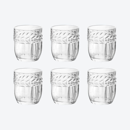 Ces verres, gracieux et élégants, sont cependant particulièrement robustes. Les fines feuilles de laurier ornant le bord créent par réfraction de la lumière dans le vin ou l'eau de jolis reflets scintillants.