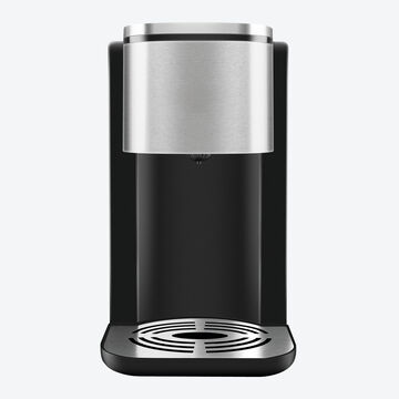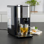 Corps Cool-Touch en matière plastique solide avec application en acier inoxydable, 16 x 28 x 30 cm (l/p/h). Réservoir d'eau en polypropylène de 2,2 l, poids 2,3 kg, pieds antidérapants, indication du niveau d'eau, pour récipients jusqu'à 15 cm de hauteur, écran tactile à affichage LCD, 230V/2.600W, 6 niveaux de température, écoulement réglable de 100, 200 ou 300 ml, cordon de raccordement 100 cm, sécurité contrôlée.