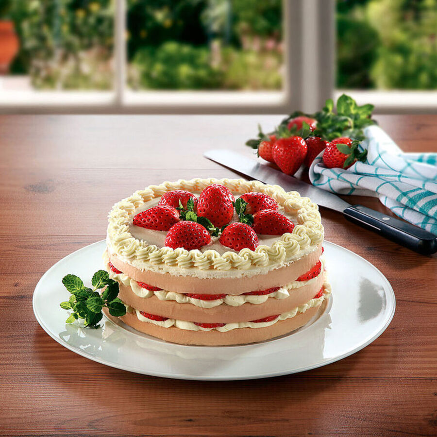 4 Réserver pour la décoration environ un tiers des fraises, couper le reste en tranches. Étaler la crème sur les trois fonds et en recouvrir deux avec les tranches de fraises. Garnir le fond supérieur avec les fraises entières et décorer à la douille d'un bord de crème.