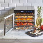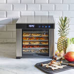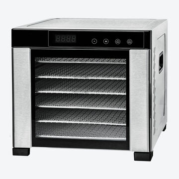 Petit modèle : 46,5 x 34 x 31,5 cm (l/p/h), poids env. 8,6 kg. 6 plateaux de séchage en acier inoxydable, 30 x 31,5 cm (surface de séchage 0,6 m²), 1 grille de séchage en plastique (sans BPA), 1 plateau de récupération (sans BPA), 230V/550-650 W.