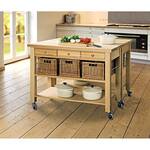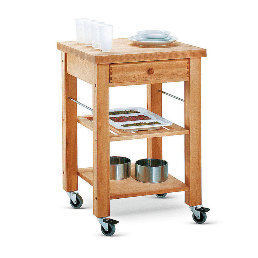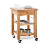 Nous faisons fabriquer pour vous nos dessertes campagnardes de qualité en bois massif solide. Les plans de travail de 3,7 cm d'épaisseur sont résistants et inusables. Les raccords à queue d'aronde trapézoïdale des tiroirs sont soigneusement travaillés. Vous aurez du mal à trouver d'autres meubles de cuisine avec un tel ouvrage de menuiserie haut de gamme. Deux étagères bien pratiques offrent suffisamment d'espace de rangement pour vos appareils lourds et de beaux paniers en osier. Les roulettes, deux sur quatre avec frein, peuvent porter chacune plus de 200 kg. Dans une grande cuisine, ces beaux meubles trouvent leur place comme ilot central. En bois de hêtre massif de haute qualité (à l'exception de la plaque dessous plaquée), avec surfaces huilées convenant au contact alimentaire.