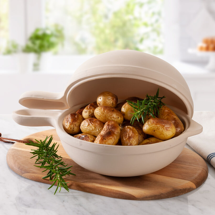 Argile naturelle, cuite à 1.100 °C, non émaillée, Ø 24 cm, avec poignée 36 cm de long, hauteur avec couvercle 16,5 cm, poids 2,8 kg, pour 1,5 kg de pommes de terre, lavage à la main recommandé. Ce produit est conçu pour une utilisation au four uniquement.