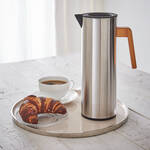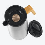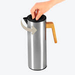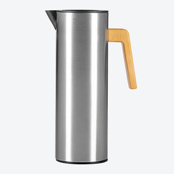 Le vide dans l'insert en verre à double paroi et le bouchon à vis hermétique et étanche avec anneau en silicone maintiennent la température longtemps. Les boissons restent chaudes ou froides jusqu'à 12 heures. La poignée en bois complète élégamment le design sobre et chic du corps en acier inoxydable.
