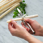 Les deux lames en acier inoxydable, placées à l'opposé et tranchantes, sont parfaitement adaptées aux contours des légumes à tige. Vous épluchez ainsi finement les asperges, avec rapidité et efficacité, rien ne se casse. Les extrémités dures peuvent être coupées à l'aide du couteau intégré. Pour gauchers et droitiers.