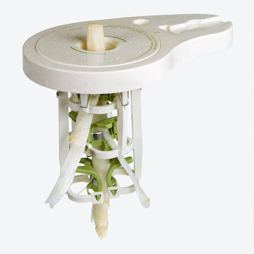 Introduire l'asperge dans l'éplucheur pointe vers le bas. Faire glisser l'asperge, au besoin avec le pilon, elle ressort immédiatement proprement épluchée. Des lames brevetées garantissent un épluchage régulier, fin et propre en une seule opération. La tête sensible de l'asperge reste complètement intacte. Un poussoir protège vos doigts pendant le travail. Avec support pour montage sur table ou au mur.