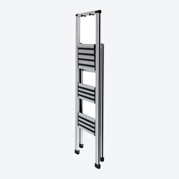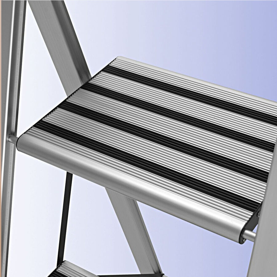 Les marches extra larges avec profil antidérapant, la bonne stabilité et le garde-corps garantissent une sécurité maximale. Replié d'un geste, cet escabeau léger mais stable ne fait plus que 5,5 cm et entre dans le plus petit espace de rangement. Structure en aluminium très résistante avec plastique, marches 31,5 x 14,5 cm, hauteur de la plus haute marche 75 cm, plateau supérieur 31,5 x 23 cm, charge maximale 150 kg, sécurité contrôlée.