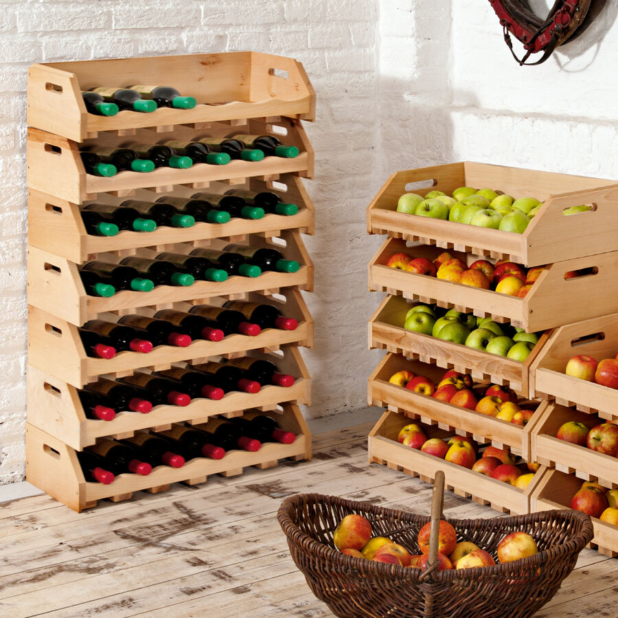 Avec cette étagère empilable mobile, utilisez n'importe quel coin libre comme espace de rangement supplémentaire. Les bouteilles de vin y sont bien rangées en toute sécurité dans les orifices pour le goulot. Bien espacées, on peut les prendre de n'importe quel endroit. Dans les compartiments pour denrées alimentaires vous entreposerez de façon bien ordonnée et accessible les fruits, les légumes et vos autres réserves. Des baguettes au sol favorisent la libre circulation de l'air, les raccords rainurés fraisés permettent un empilement en toute sécurité, des poignées sur les côtés facilitent le transport. Hêtre massif non traité, 60 x 30 x 16 cm de hauteur, poids 2,5 kg, raccords vissés solides pour une utilisation durable, jusqu'à 10 étagères peuvent être empilées les unes sur les autres en toute sécurité, chacune d'elle pouvant supporter 25 kg.