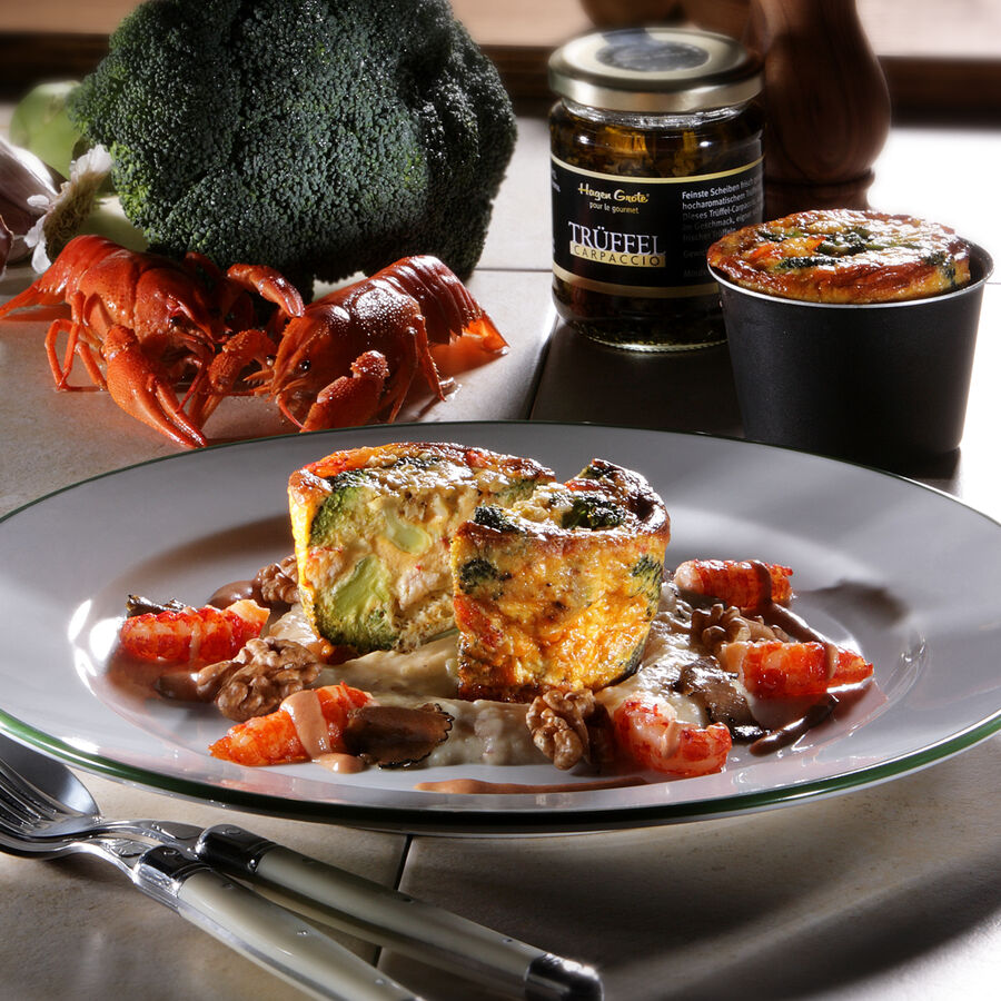 4 Beurrer les moules. Disposer le brocoli puis la chaire d'écrevisse tour à tour dans les moules et presser légèrement. Garder quelques queues d'écrevisse pour la décoration.