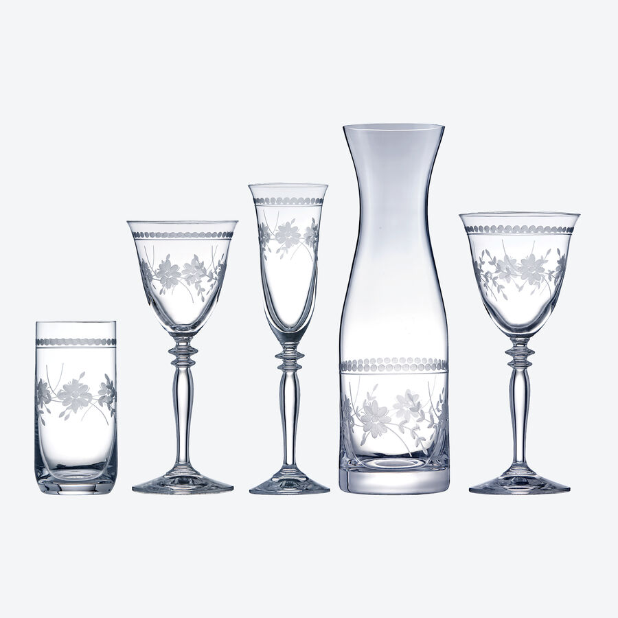 L'art du soufflage de verre de Bohême permet la fabrication classique de ces magnifiques verres vintage. Des fleurs et du feuillage stylisés ennoblissent durablement les verres grâce à la technique raffinée de pantographie. D'une transparence et d'une brillance exceptionnelles, ils répondent aux critères de qualité les plus exigeants.