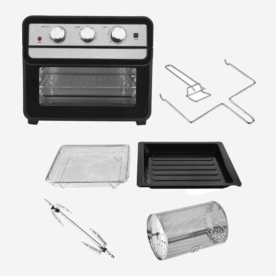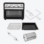 Boîtier en plastique/acier inoxydable 40 x 38 x 35 cm (l/p/h), intérieur 22 l, 32,5 x 29 x 20 cm (l/p/h), porte en verre résistant à la chaleur, minuterie de 60 minutes avec arrêt automatique, éclairage intérieur. Large gamme d'accessoires : plaque de cuisson émaillée profonde, 34 x 26 cm (l/p), grille de cuisson chromée 34 x 26 cm (l/p). Panier à friture extra profond 34 x 26 x 3 cm (l/p/h), cage à friture Ø 11,7 cm et broche tournante en acier chromé. Aide saisie des accessoires, fonction four 1 600 watts, fonction friture 1 700 watts, câble de 0,9 m, pieds caoutchoutés antidérapants.