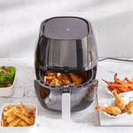 Corps en plastique, 38 x 39 x 38 cm (l/p/h), poids 1,49 kg, panier de friture en acier inoxydable avec revêtement antiadhésif, capacité 6 l, pieds caoutchoutés antidérapants, 230V/1 800W, écran tactile, câble de 1 m.
