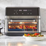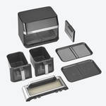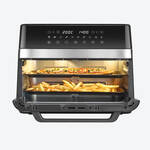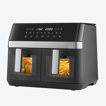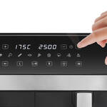 Corps en plastique/acier inoxydable, 43,5 x 38,5 x 33,5 cm (l/p/h), poids 9 kg, pieds antidérapants, 2 paniers de cuisson avec grille intérieure et revêtement antiadhésif en Téflon sans BPA, écran tactile, 230 V/2 200 W, minuterie (1-60 min.), fonction rappel, câble 90 cm, sécurité testée, livré avec plaque de cuisson et plaque perforée pour frites et pizza.