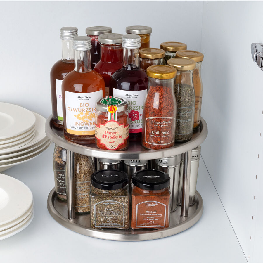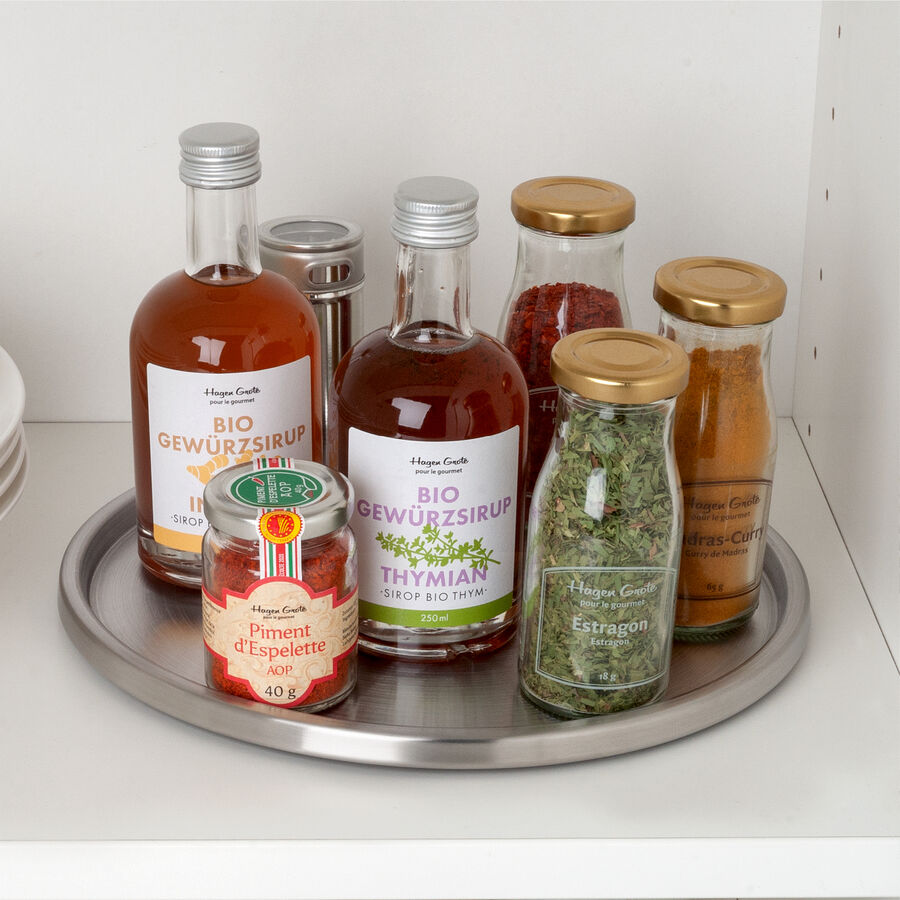 Finies les recherches fastidieuses dans vos placards, sur votre bureau ou dans le réfrigérateur. Une légère rotation, et vos objets sont à portée de main. Pivote à 360°, permettant un accès rapide. Un rebord empêche les objets de tomber du plateau. Surface en acier brossé, peu fragile, les traces de doigts ne marquent pas.