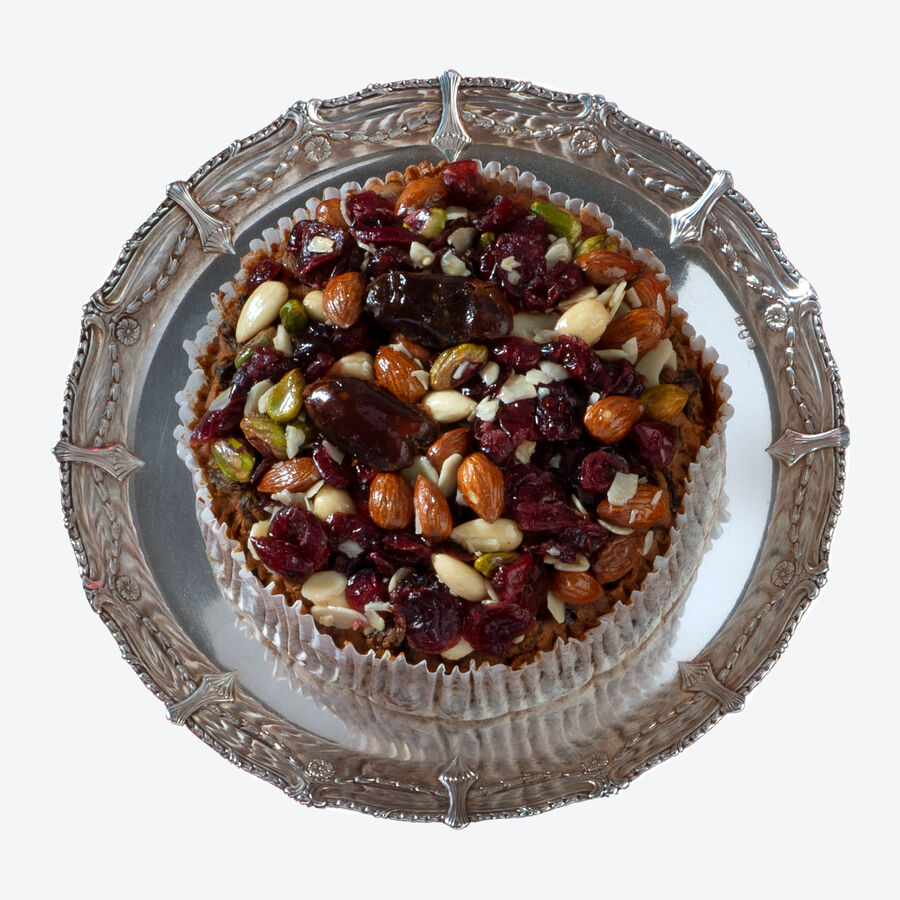 sultanines (40%) (raisins secs, huile de palme), farine de blé, sucre, oeufs, margarine végétale (huile de colza et huile de palme, eau, sel, émulsifiant : mono- et diglyceride d'acides gras, lécithine, colorants alimentaires : annato, curcumine, arômes), airelles (5%) (airelles, sirop de glucose, huile de tournesol), noix (3%), dattes (3%), sirop de glucose, amandes (3%), brandy (2%), mélasse noire, noix de pecan (2%), glaçage (eau, amidon modife de pomme de terre, sucre, acide citrique, sorbate de potassium), noix du Brésil (1%), pistaches (1%), noisettes (1%), humectant : glycerine végétale, farine de soja, cerises (0,5%) (cerises, glucose/fructose, sucre, correcteur d'acidite : acide citrique, colorant alimentaire : anthocyanes, conservateur : sorbate de potassium, dioxyde de soufre), poudres à lever : carbonate acide de sodium, diphosphate. Contient : lait, noisettes, soja, sulfites, oeufs.