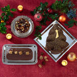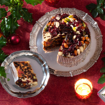 sultanines (40%) (raisins secs, huile de palme), farine de blé, sucre, oeufs, margarine végétale (huile de colza et huile de palme, eau, sel, émulsifiant : mono- et diglyceride d'acides gras, lécithine, colorants alimentaires : annato, curcumine, arômes), airelles (5%) (airelles, sirop de glucose, huile de tournesol), noix (3%), dattes (3%), sirop de glucose, amandes (3%), brandy (2%), mélasse noire, noix de pecan (2%), glaçage (eau, amidon modife de pomme de terre, sucre, acide citrique, sorbate de potassium), noix du Brésil (1%), pistaches (1%), noisettes (1%), humectant : glycerine végétale, farine de soja, cerises (0,5%) (cerises, glucose/fructose, sucre, correcteur d'acidite : acide citrique, colorant alimentaire : anthocyanes, conservateur : sorbate de potassium, dioxyde de soufre), poudres à lever : carbonate acide de sodium, diphosphate. Contient : lait, noisettes, soja, sulfites, oeufs.