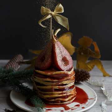 • Image du produit pour ' Gâteaux de pancakes à la cannelle avec poires au vin rouge et glace à la vanille'