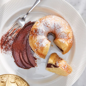 2 Verser 2/3 de la pâte dans les moules à fleurs en spirale graissés. Ajouter le cacao tamisé, le sucre et le rhum au dernier tiers. Étendre cette pâte au chocolat sur la pâte claire et l'incorporer en spirale à l'aide d'une fourchette à gâteau, vous obtenez ainsi un motif marbré.