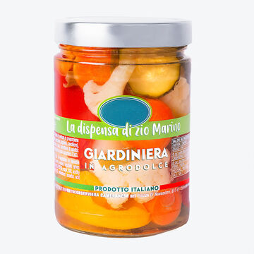 Des légumes italiens mûris au soleil sont la base de cette spécialité savoureuse. Poivrons, carottes, oignons, courgettes, haricots verts et chou-fleur sont marinés avec soin dans une préparation équilibrée à base d'huile de tournesol, de vinaigre, d'herbes et d'épices. Leur saveur aigre-douce et épicée sublime les antipasti, les salades (mayonnaise, thon, &oelig