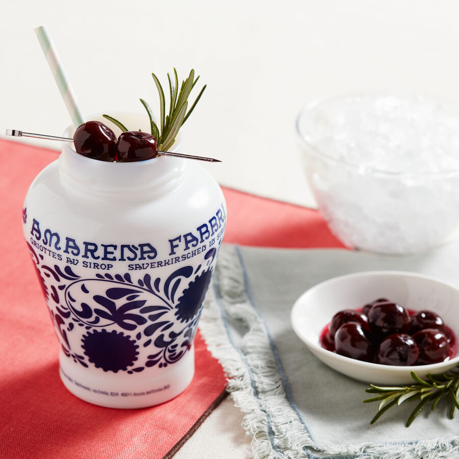 Frotter l'intérieur d'un verre à vin avec une branche de romarin. Remplir le verre de glaçons et ajouter les ingrédients dans l'ordre indiqué. Garnir d'une branche de romarin et d'une cerise amarena.