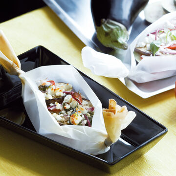 Dresser le gratin dans les barques de papier parchemin sur les assiettes préchauffées. Laisser couler quelques gouttes d´Aceto balsamico et garnir des feuilles de basilic.