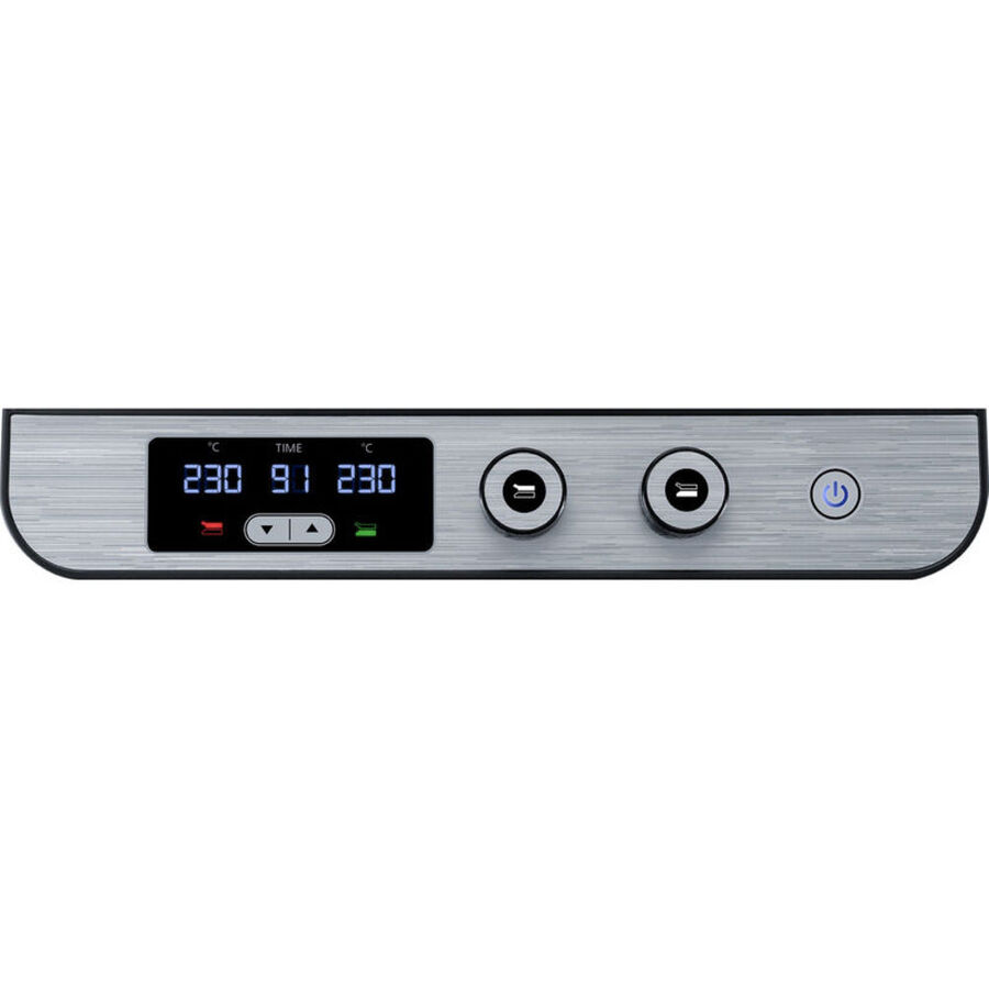 Le boîtier est en acier inoxydable, 37 x 36 x 15 cm (l/p/h), poids 5,3 kg, 230V/1800W, affichage LED pour la température et la minuterie (de 1 à 99 minutes), câble de raccordement 70 cm, sécurité testée.