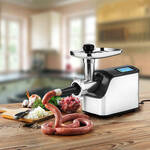 Vous choisissez parmi les 6 programmes automatiques le niveau de vitesse optimal pour hacher la viande fraîche ou surgelée, le poisson, l'extraction de jus ainsi que la fonction râpe multiple. L'appareil robuste, avec ses 220 tours/minute travaille jusqu'à 35 kg de viande par heure. La touche marche arrière réglable fait ses preuves avec les cartilages et les tendons de la viande ainsi que pour le nettoyage de restes de fibres. Les accessoires en option transforment le hachoir à viande puissant en une centrifugeuse à froid (accessoire Slow-Juicer) ainsi qu'en une râpe multi-usage avec trois tambours interchangeables pour couper, râper fin et gros.