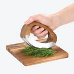 Ses trois lames tranchantes en acier inoxydable hachent rapidement et sans effort herbes, épices, noix, chocolat et bien d'autres ingrédients, sans les écraser. Grâce à ses poignées ergonomiques en bois d'acacia de qualité, le couteau tient parfaitement en main. La planche à découper fournie, également en bois d'acacia robuste, est parfaitement adaptée à la forme du couteau. De fines rainures maintiennent les lames en place pour une maîtrise totale de la coupe.