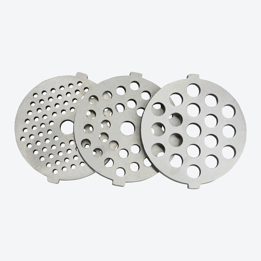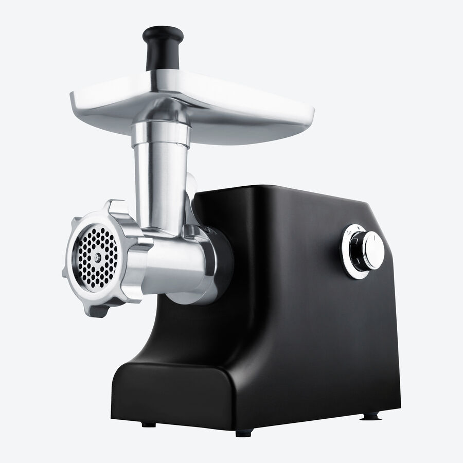 Aluminium, 18 x 37 x 31,6 cm (l/p/h), 2 vitesses et marche arrière, pieds en caoutchouc antidérapant, 3 grilles (fin, moyen, grossier), bac de remplissage, poussoir, entonnoir à saucisse, accessoire à biscuits (spritz), 230V/2000W, câble de raccordement 1 m, rangement du câble, sécurité testée