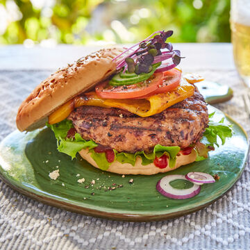 Badigeonner les moitiés inférieures des pains à burger de ketchup et les garnir de salade, de la viande, des moitiés de poivron grossièrement découpées et grillées, des tomates, des concombres et des rondelles d'oignon. Parsemer le tout de cresson, puis poser les deuxièmes moitiés de pain.