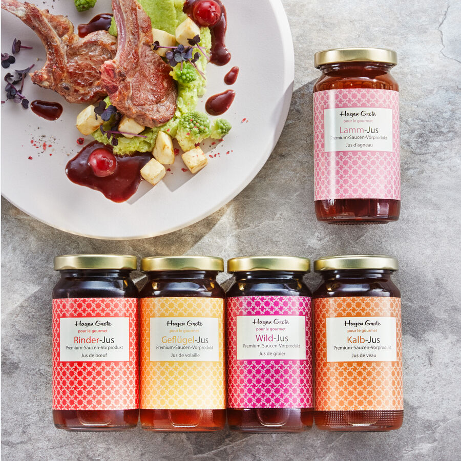 Le Jus de viande est la base de toute sauce au goût intense et aromatique, indispensable à l'art culinaire haut de gamme. Plus puissants et aromatiques que les simples fonds, ces jus sont le fruit d'une élaboration minutieuse, issus d'os et légumes grillés et de fonds de viande qui mijotent environ douze heures! La saveur du jus de viande et des arômes grillés atteint alors une très forte concentration. On en écume plusieurs fois la mousse et l'arrose de vin rouge ou blanc, selon la viande. Après refroidissement, la graisse qui surnage est retirée. Il suffit ensuite de lier le jus avec du beurre, de la farine ou de la fécule. Selon l'emploi, la sauce sera affinée avec de la crème fraîche, un alcool (par exemple du porto, du cognac ou du Noilly Prat), des herbes ou épices. Ces jus sont également délicieux pour cuisiner vos plats en sauce, vos poêlées de champignons et légumes ou vos émincés. Nos jus de viandes proviennent d'une fabrication artisanale professionnelle et sont indispensables comme base de cuisine haut de gamme. Uniquement des ingrédients purs et naturels, sans conservateurs ni colorants.
