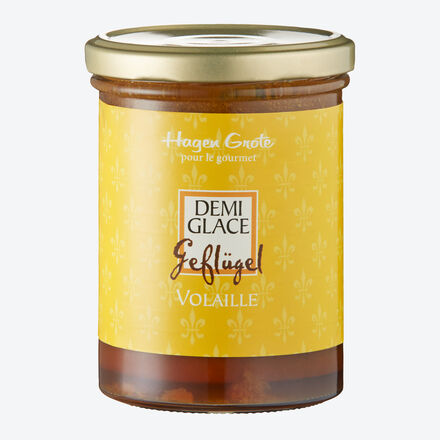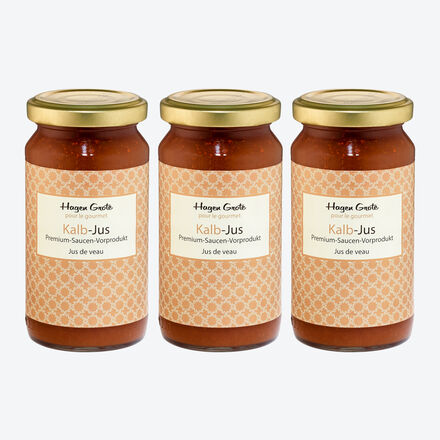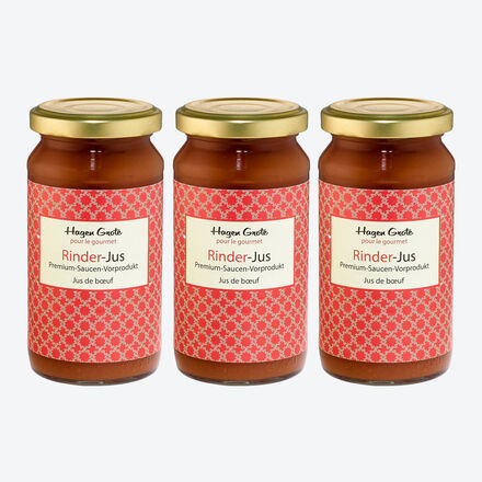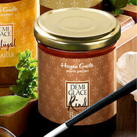 Le Jus de viande est la base de toute sauce au goût intense et aromatique, indispensable à l'art culinaire haut de gamme. Plus puissants et aromatiques que les simples fonds, ces jus sont le fruit d'une élaboration minutieuse, issus d'os et légumes grillés et de fonds de viande qui mijotent environ douze heures! La saveur du jus de viande et des arômes grillés atteint alors une très forte concentration. On en écume plusieurs fois la mousse et l'arrose de vin rouge ou blanc, selon la viande. Après refroidissement, la graisse qui surnage est retirée. Il suffit ensuite de lier le jus avec du beurre, de la farine ou de la fécule. Selon l'emploi, la sauce sera affinée avec de la crème fraîche, un alcool (par exemple du porto, du cognac ou du Noilly Prat), des herbes ou épices. Ces jus sont également délicieux pour cuisiner vos plats en sauce, vos poêlées de champignons et légumes ou vos émincés. Nos jus de viandes proviennent d'une fabrication artisanale professionnelle et sont indispensables comme base de cuisine haut de gamme. Uniquement des ingrédients purs et naturels, sans conservateurs ni colorants.