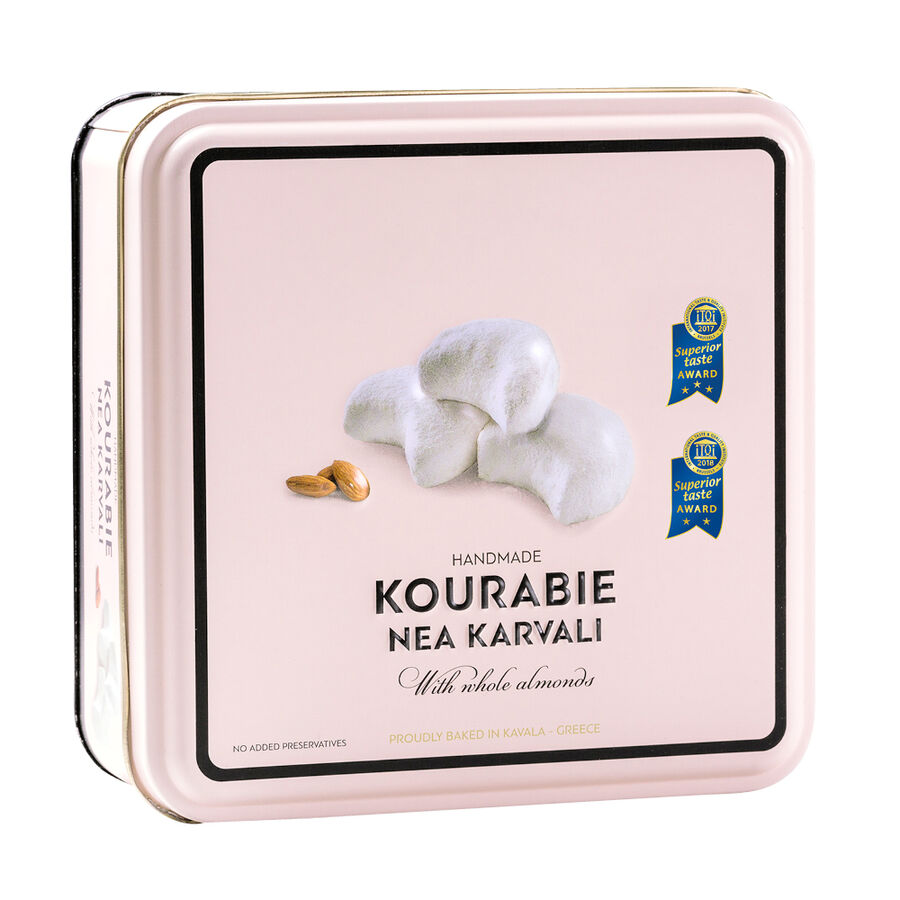 Kourabiedes est le nom donné à ces pâtisseries aux amandes, un classique de Noel en Grèce. Les biscuits sont cependant si irrésistibles qu'on peut les apprécier toute l'année. Confectionnés à partir d'amandes entières selon une recette familiale transmise de génération en génération, ils déploient un plein arôme d'amande dans une texture fine et croquante. Chaque biscuit est soigneusement façonné à la main et roulé dans du sucre glace alors qu'il est encore chaud. Néanmoins, le kourabies n'est pas si sucré. Fabriqué à partir des meilleurs ingrédients purement naturels dans une confiserie familiale fondée en 1924 dans la ville portuaire de Kavala.