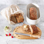Grâce aux excellentes propriétés du métal et du bambou, qui évitent la formation d'humidité et de moisissures, les pains y restent croustillants et frais plus longtemps. La circulation de l'air à travers le couvercle qui repose librement y contribue également. Une fois retourné, il sert également de planche à découper ou de planche de service. Essuyer de temps en temps la boîte à pain avec du vinaigre pour préserver l'hygiène. Livrée avec un couteau à pain à lame crantée de haute qualité et un sac en coton pour transporter le pain de manière écologique après l'achat. Convient également pour conserver les biscottes, la brioche, les viennoiseries.