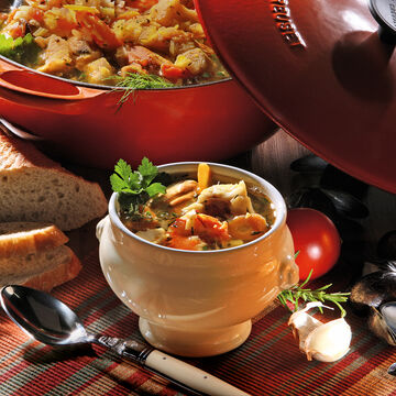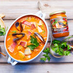 La base est décisive pour le goût de la soupe de poisson provençale mondialement connue. Dans notre manufacture de produits fin, nous la produisons à partir de notre fond de poisson réduit (lors d'un test en aveugle par la revue « Der FEINSCHMECKER »05/2012, un jury d'experts indépendants a désigné le fond de poisson Hagen Grote comme l'un des 6 meilleurs FONDS parmi 50). Ajouter à celui-ci des légumes frais, une très bonne huile d'olive, des épices méditerranéenne et du safran. Vous n'avez plus qu'à réchauffer cette excellente base de bouillabaisse. Ajoutez par bocal de 500 ml environ 300 g de filets de poisson mélangés. Réchauffez à nouveau (les filets de poisson froids réduisent la température) et laisser mijoter 10 minutes à 90 °C. Affinez éventuellement et selon votre goût avec un peu de liqueur d'anis. Délicieuse aussi en base de risotto aux fruits de mer ou réduite en sauce pour des plats de poisson.