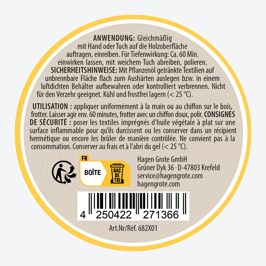 Avec des ingrédients entièrement naturels, sans additifs chimiques, la cire pour bois est le soin idéal pour tout bois entrant en contact avec les aliments. La combinaison de l'huile de lin pure et de la cire d'abeille de qualité apicole fait ressortir la beauté des couleurs et le grain du bois d'origine. En même temps, l'entretien naturel permet au matériau naturel de respirer. Les planches à découper ou de service, les plans de travail, les meubles de cuisine en bois et les ustensiles sont conservés en permanence.