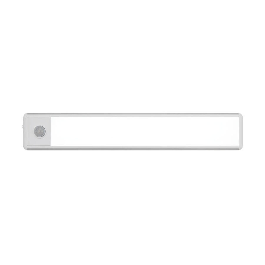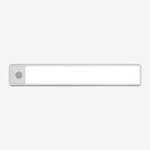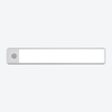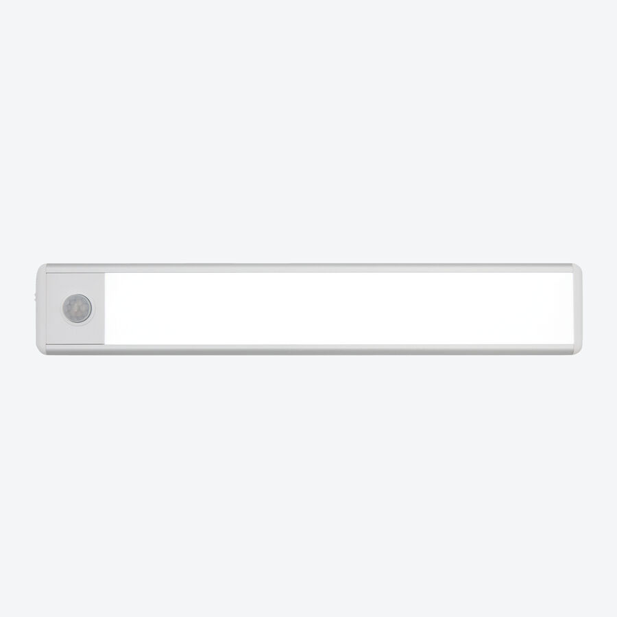 Aluminium/plastique, 23,5 x 4 x 0,5 cm (l/p/h), mode automatique avec capteur de mouvement, câble de recharge USB.