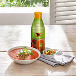 Ce gaspacho rafraîchissant voit le jour dans notre atelier d'épicerie fine. Des tomates mûries en été, des poivrons épicés, du concombre, de l'huile d'olive vierge extra et un peu d'ail sont les ingrédients naturels et de saison de ce classique espagnol. La recette de nos grands chefs peut tout au plus être améliorée lors de la présentation par de jolies décorations alimentaires. Bien agiter avant de répartir dans des petits verres, des tasses ou des assiettes et servir froid, mais pas glacé. Dresser avec quelques gouttes de la meilleure huile d'olive, des rouleaux de ciboulette ou des lamelles de jambon Serrano.