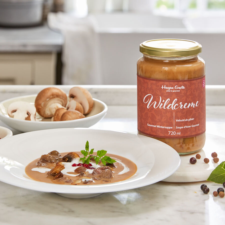 Dans la manufacture de produits fins Hagen Grote, nous produisons ce délicat velouté à base de fond de gibier fin et de la meilleure viande de cerf. Des champignons frais, de la crème, du vin rouge, du thym et du romarin complètent le goût de ce classique de la cuisine d'hiver gastronomique. Préparation : bien remuer, réchauffer brièvement dans une casserole (ne pas cuire), servir immédiatement.