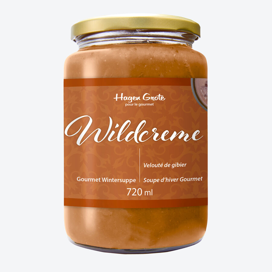 Dans la manufacture de produits fins Hagen Grote, nous produisons ce délicat velouté à base de fond de gibier fin et de la meilleure viande de cerf. Des champignons frais, de la crème, du vin rouge, du thym et du romarin complètent le goût de ce classique de la cuisine d'hiver gastronomique. Préparation : bien remuer, réchauffer brièvement dans une casserole (ne pas cuire), servir immédiatement.