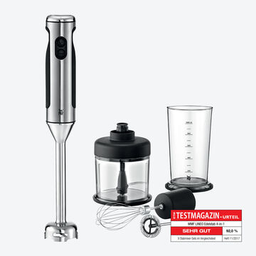 Le puissant mixeur plongeant de 700 watts hache facilement même les ingrédients durs tels que les fruits surgelés, ce qui le rend idéal pour la préparation des sorbets et des glaces. Avec l'accessoire mousseur à lait, vous préparez non seulement une mousse de lait aérée, mais aussi de la mayonnaise, des sauces et des vinaigrettes. Car même les liquides difficilement miscibles se lient parfaitement. Les repas pour bébés, les milk-shakes et les smoothies sont, quant à eux, un jeu d'enfant pour le mixeur plongeant de WMF.