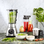 Son puissant moteur de 1 800 W (2,4 cv) entraîne le robuste couteau en acier inoxydable à 6 lames, à revêtement titane. Avec une vitesse réglable en continu jusqu'à 28 000 tr/min et une fonction Pulse, vous réussirez boissons glacées, sorbets et milkshakes raffinés, soupes crémeuses ou purées pour bébé. La rupture optimale des structures cellulaires délicates des fruits et légumes permet d'obtenir des préparations saines et riches en nutriments. Un bol supplémentaire de 0,75 l avec une lame en acier inoxydable permet de moudre les grains de café, les noix, les herbes séchées et les épices en un clin d'oil et sans aucun reste. Les programmes prédéfinis permettent de préparer des smoothies et de la glace pilée en appuyant sur un bouton. Grâce à l'ouverture spéciale, il est possible d'ajouter des ingrédients ou du liquide supplémentaires dans le pichet en verre à tout moment pendant le mixage. Livré avec une gourde pour la préparation de boissons à emporter.