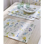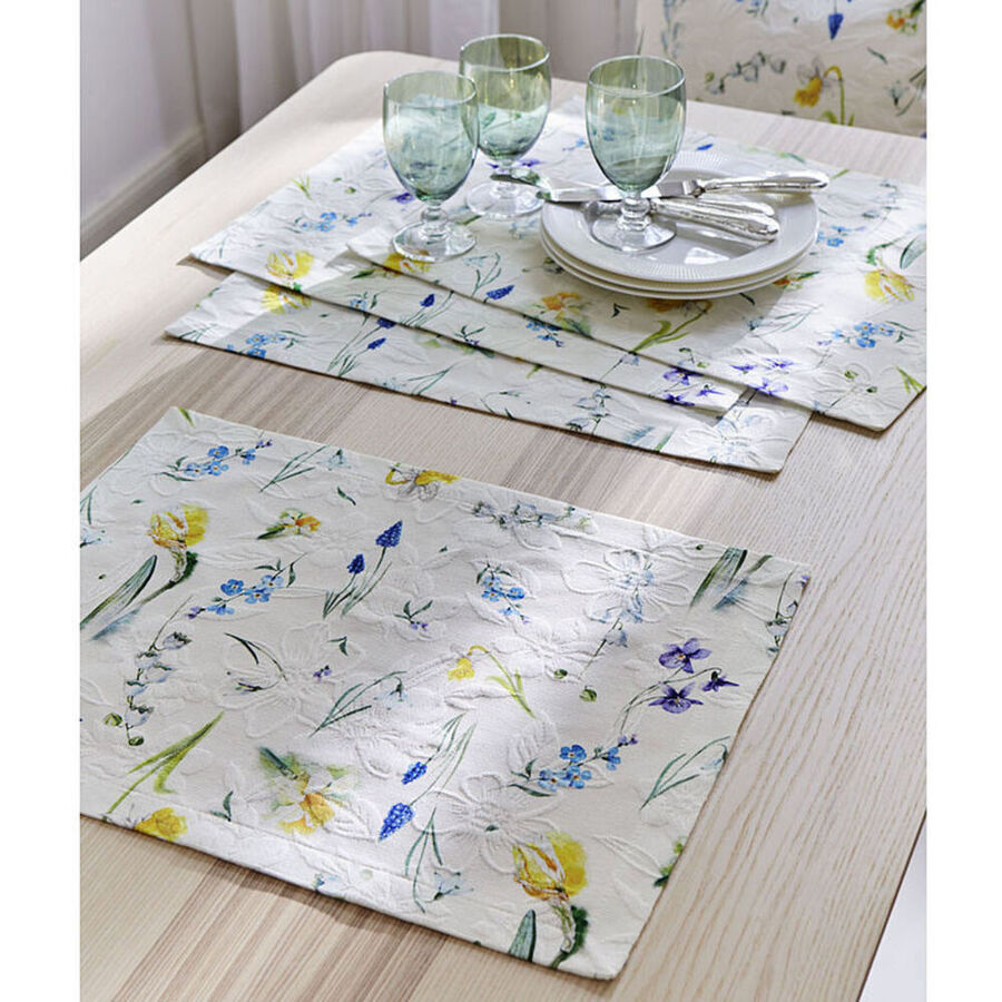 La structure en relief du matelassé nait sur les métiers à tisser jacquard classiques, utilisant plusieurs fils de trame. Ils créent une sorte de coussin entre les deux épaisseurs de tissus. Pour ce linge de table de fabrication sophistiquée, le motif de tissage floral est complété de motifs de fleurs photoréalistes. Du muguet, des jonquilles et des myosotis apposés par impression numérique apportent au solide tissu ses couleurs lumineuses. Des housses de coussin, assorties aux nappes, sets, et chemins de table aux coins en onglet soigneusement travaillés, complètent vos décorations printanières pour une jolie table.